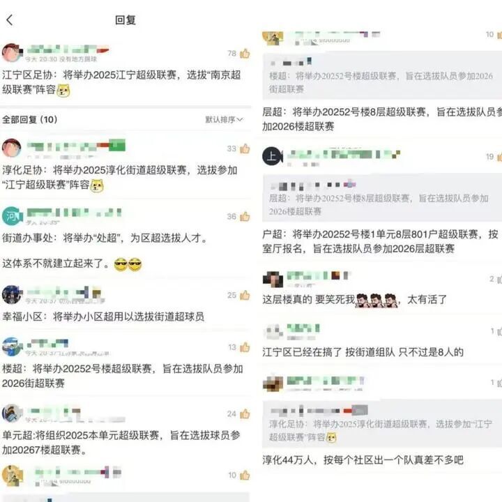 “南超”即将开赛的消息一经传出,迅速在网络上引发热议。不少网友为南京足协的细致筹备点赞,直呼“南哥好认真!”。还有不少人则围绕“散装江苏”的梗展开欢乐创作,从“区超”“社区杯”一路脑补到“楼栋联赛”“家庭PK”,一套层层递进的“民间足球体系”被网友们安排得明明白白。